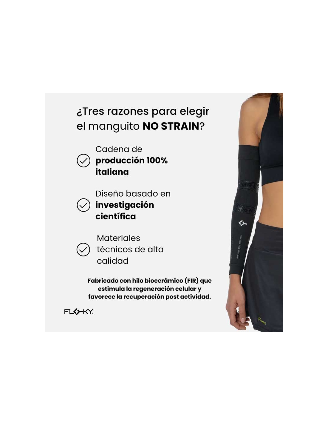 Gracias a su estructura inteligente, los Manguitos Floky No Strain controlan la inflamación y mejoran la circulación local, acelerando los procesos de regeneración muscular.